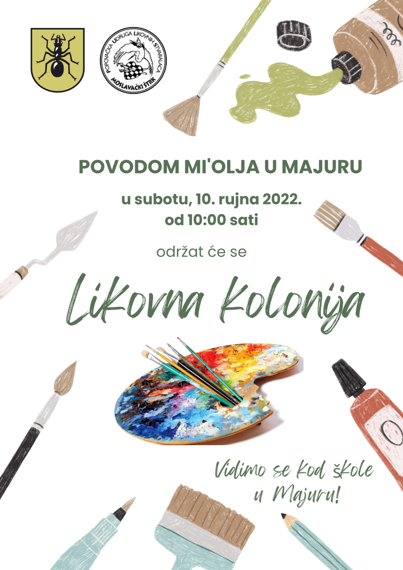 U subotu, 10. rujna 2022. godine, u Majuru će se povodom Mi’olja održati Likovna kolonija. Članovi Popovačke udruge likovnih stvaralaca svoje će vještine prezentirati u dvorištu stare škole u Majuru. Pozivamo sve zainteresirane da ih dođu podržati od 10:00 sati nadalje.