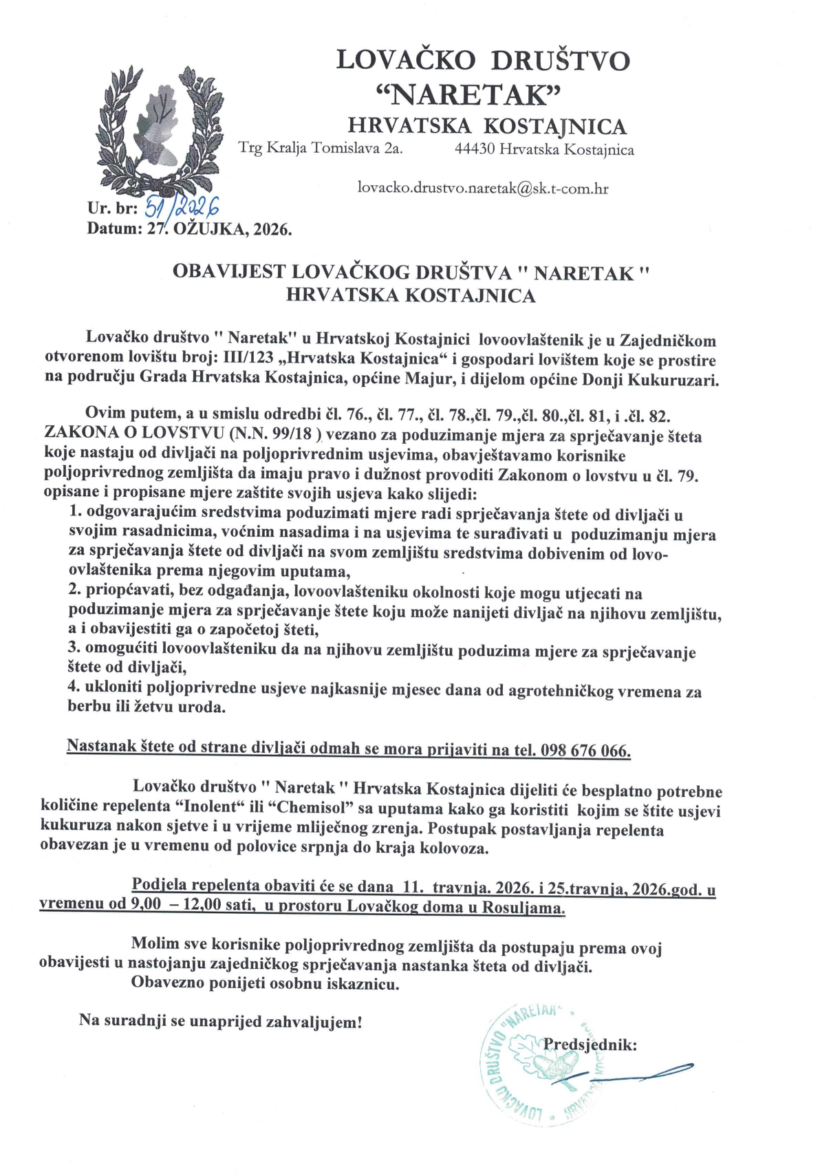 u vremenu od 9:00 do 12:00 sati, u lovačkoj kući LD „Naretak“, Rosulje 89.